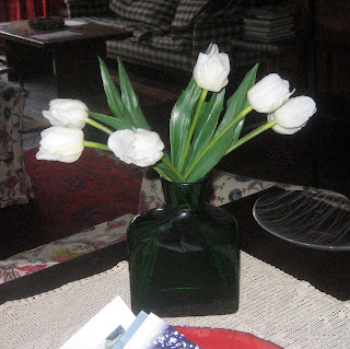 Jag ställer fram våra konstgjorda tulpaner i plast och trä,