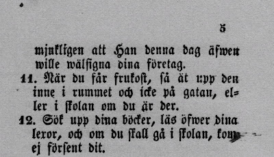 ”Var därför glad åt att i hemmet få lära dig goda vanor: att lyda och hurtigt hjälpa till, att vara flitig och rask, att vara ärlig och ej krångla med sanningen, att göra din plikt och att ej väja undan för det, som är svårt.”