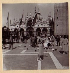 Första gången jag var i Venedig var 1953. Denna tredje (och som det ser ut sista) gång 1958 var det fortfarande ”lagom” med folk. Här poserar jag elegant i sömmerskesydd dräkt, krokodilväska och svinrygg!