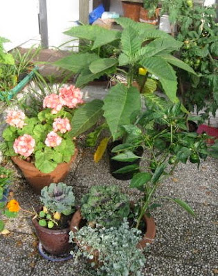 Eftersom vintern har varit så kall har jag måst ha alla krukplanterade ”balkongväxter” inomhus. Det så kallade ”lekrummet”, som har en perfekt temperatur på ca 10° och österfönster, har varit belamrat.