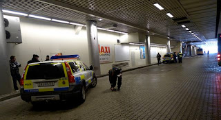 Väl framme vid Knutpunkten märktes det att jag var ute i stora stygga världen, två polispiketer med hundpatruller stod parkerade i bussterminalen. Det fick mig att erinra mig eskilstunagruppens ankomst den 28 juli 2007: