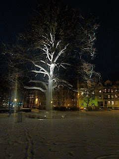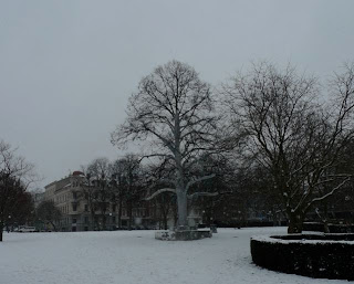 Promenaden genom Stadsparken blev en kontrast: I det singlande snöfallet iakttog jag ett träd med en silverne piedestal, nu klätt i vita tygsjok.