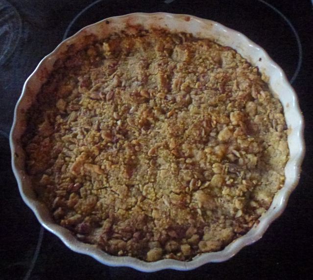 Sätt ugnen på 225°. Grovhacka nötterna till smuldegen*. Dela smöret i bitar. Lägg alla ingredienserna i en bunke och arbeta till en smulig deg. Kärna ur och riv äpplena grovt.** Blanda med socker och kryddor. Lägg blandningen i en smord ugnssäker form ca 22 cm i diameter. Fördela smuldegen över.